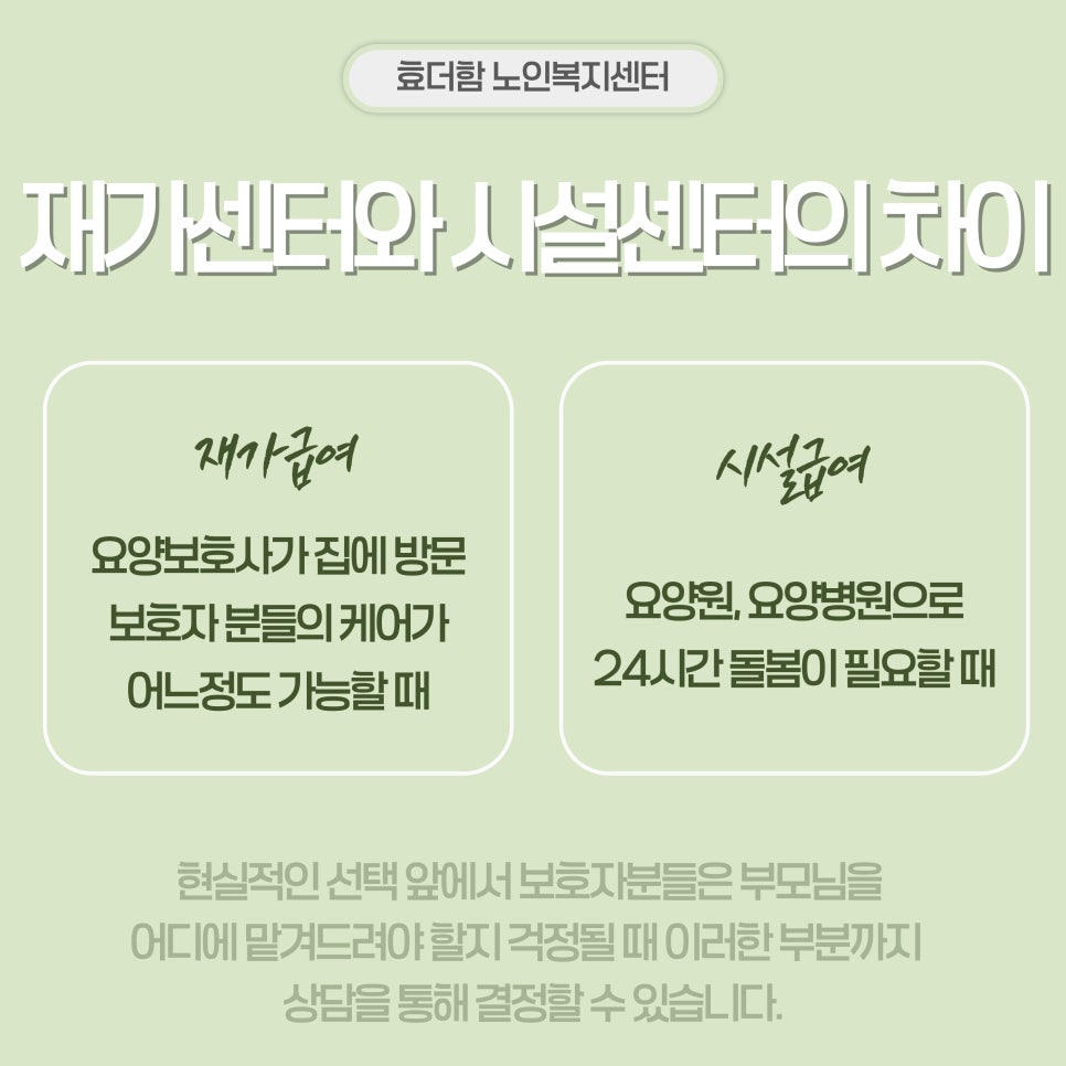Çö½ÇÀûÀÎ ¼±Åà ¾Õ¿¡¼ º¸È£ÀںеéÀº ºÎ¸ð´ÔÀ» ¾îµð¿¡ ¸Ã°Üµå·Á¾ß ÇÒÁö °ÆÁ¤ÀÌ µÇ±âµµ ÇÏ°í ¸·¸·ÇÔÀÌ º¸À̱⵵ Çϴµ¥¿ä. ÇÏÁö¸¸ °ü¾Ç±¸ Àç°¡¼¾ÅÍ¿¡¼ ÀÌ·¯ÇÑ ºÎºÐ±îÁö ÄɾîÇÏ°í »ó´ãÀ» ÅëÇØ °áÁ¤ÇÒ ¼ö ÀÖ½À´Ï´Ù.